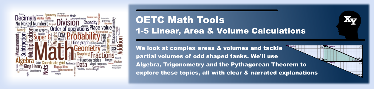 In Math Tools 1-5 we wrap up the Fundamental Math Series with our last subjects of Linear, Area and Volume determinations and practice what we’ve learned with algebra. We tackle angles using trigonometry. We look at complex areas and volumes and tackle partial volumes of odd shaped tanks. We use trigonometry, geometry and algebra to calculate various aspects of these three dimensions.