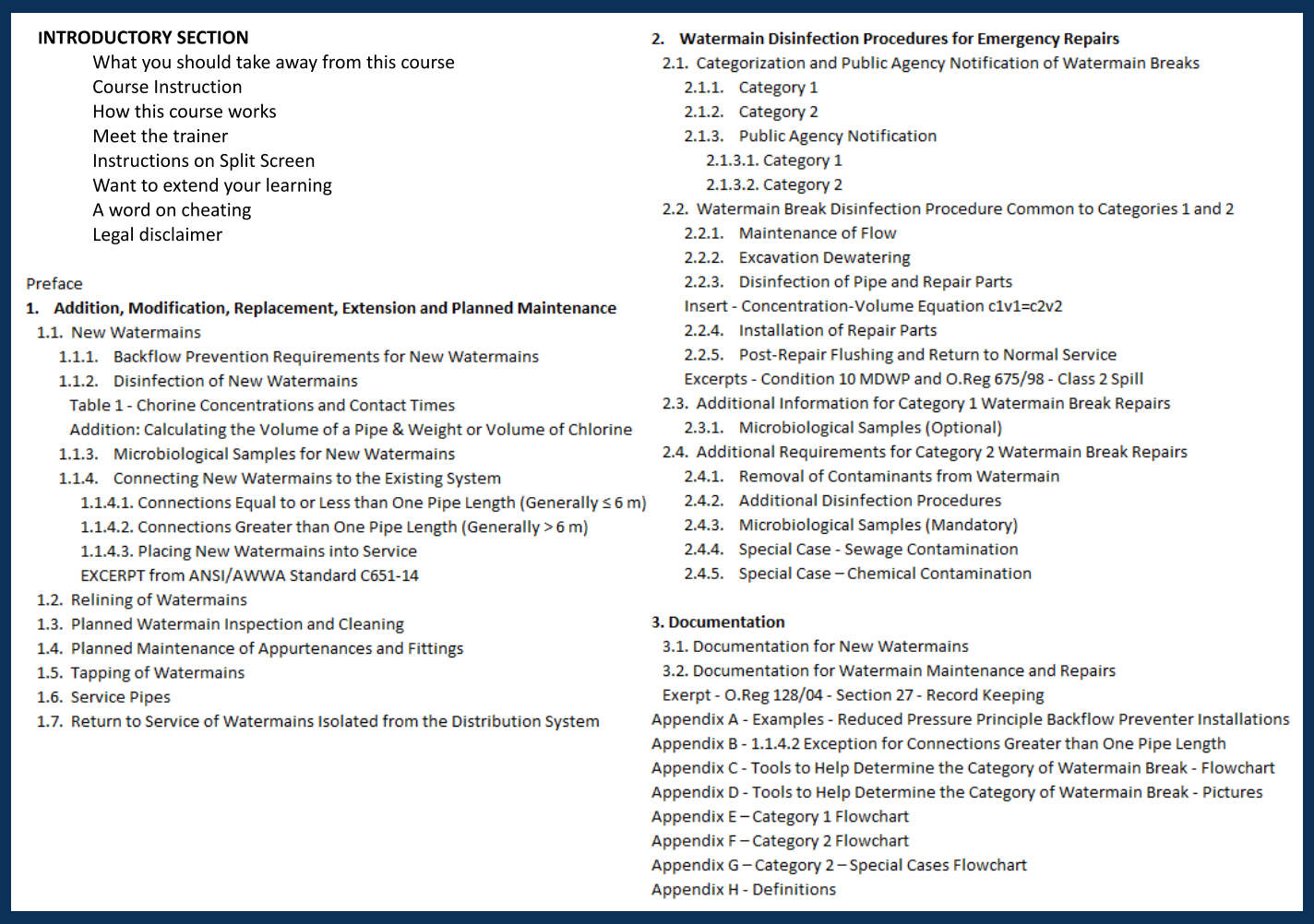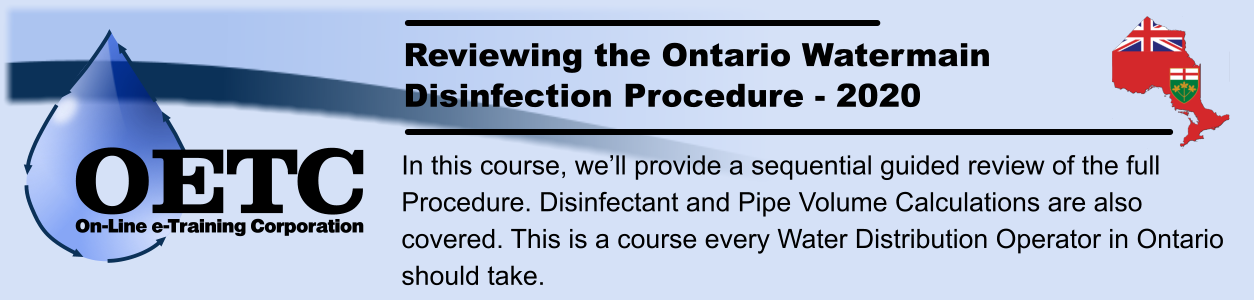 Included in this course is a 40pg manual that encompasses the full Procedure with additional information from AWWA C651, the Municipal Water Works Permit, regulatory excerpts, and example of mathematical calculations for pipe volume and disinfectant solution mixing.